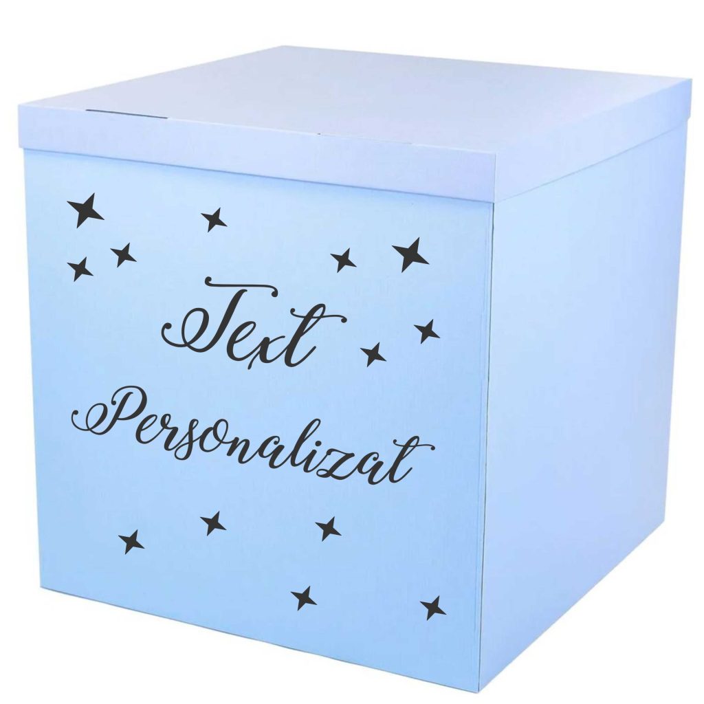 Dimensiunea cutiei este de 70 cm x 70 cm x 70 cm. Orice set de baloane se va potrivi cu ușurință pentru ea! La alegere vom adăuga un bant la capacul cutiei și o inscriptie personalizată, creând astfel o cutie cadou în interiorul căreia va fi compoziția de baloane sau puteți pune careva cadouri în ea. Capacitatea maximă a acestei cutii este de 9 baloane standarte de 30 cm, sau 60 baloane de 13cm, luați în considerare acest lucru atunci când plasați o comandă!